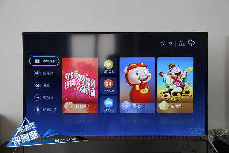 主界面的左侧为系统选项:本地媒体、信号源、设置、电视派、酷开儿童5大分类。