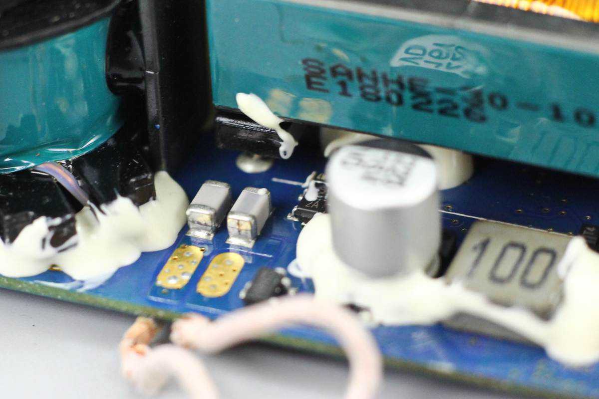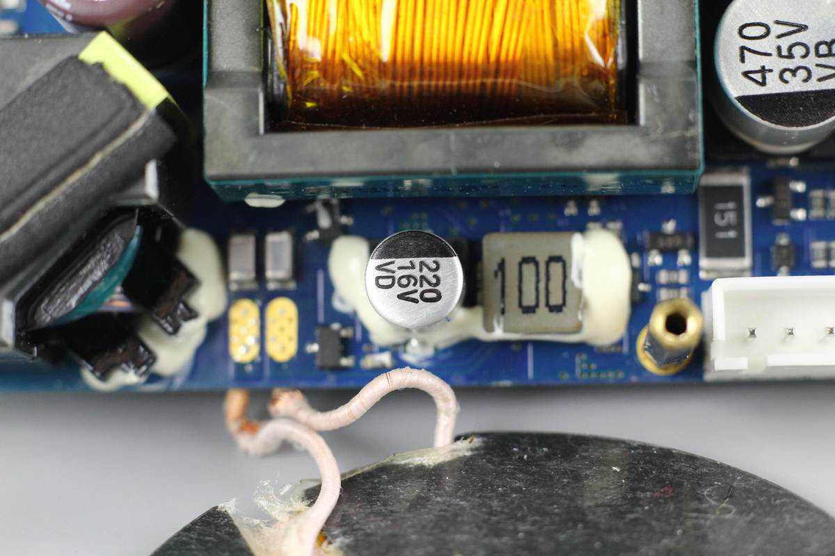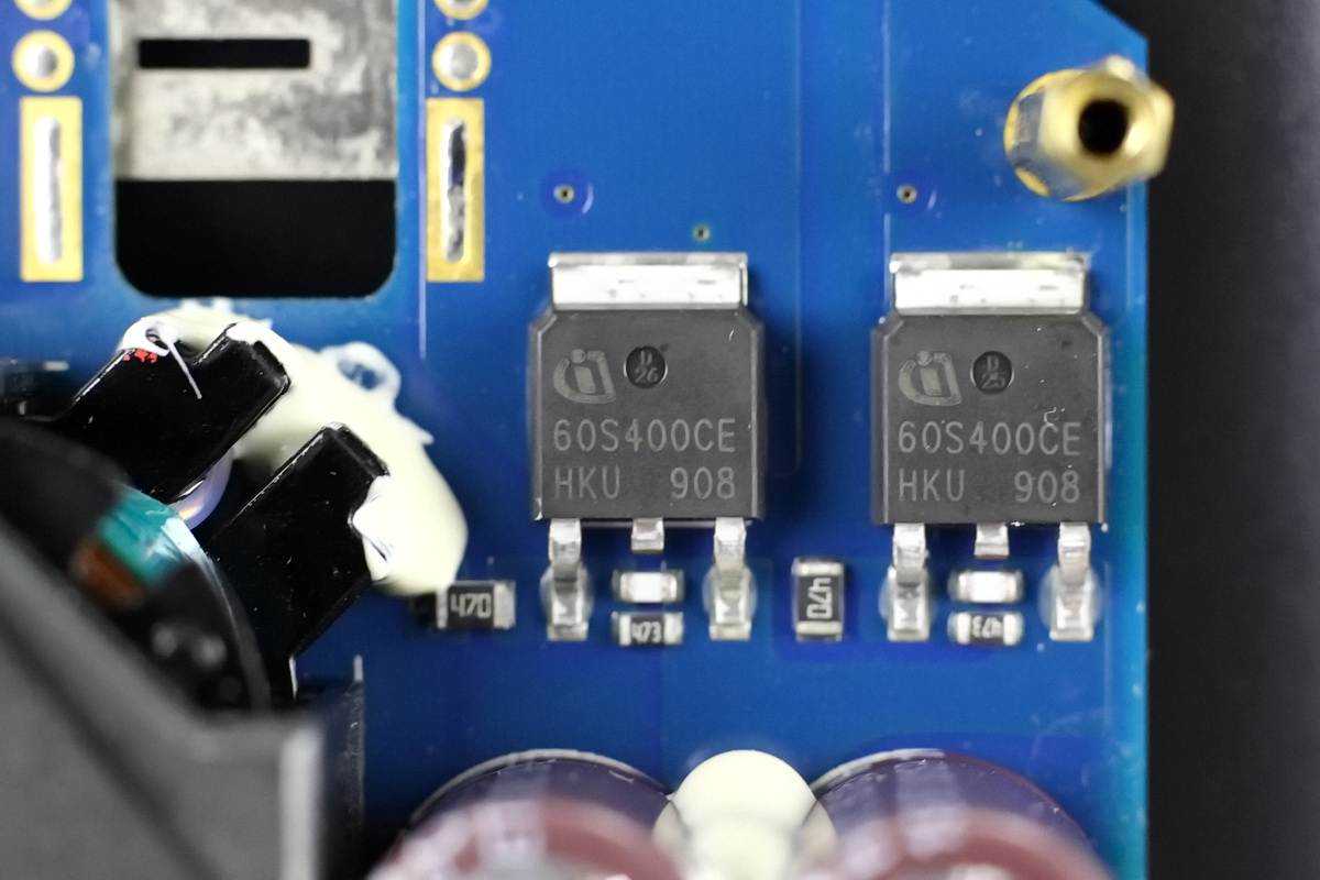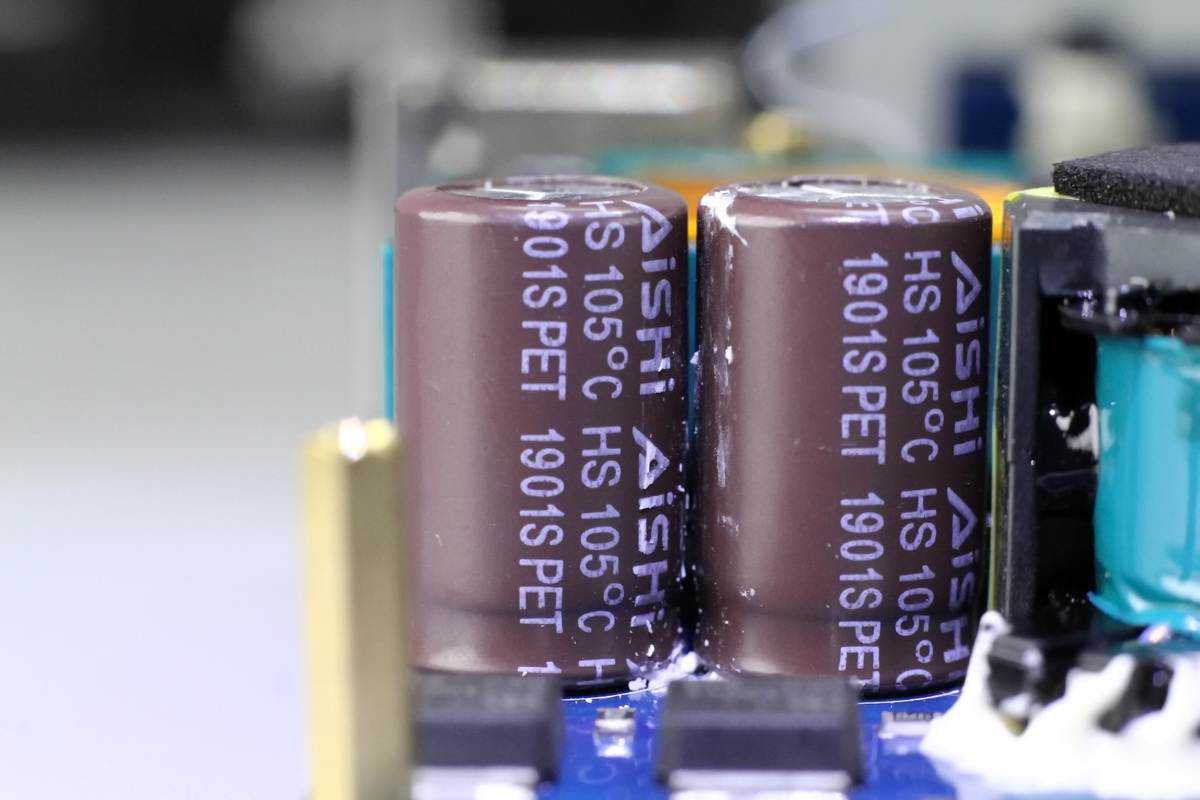 变压器一侧设有两颗输入滤波固态电容,规格都是35V470μF。