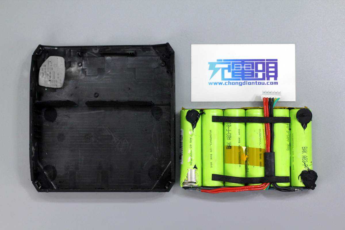 电池和保护电路板镍片点焊连接,PCB板上可以看到六颗相同的保护芯片,整个板子注塑保护。