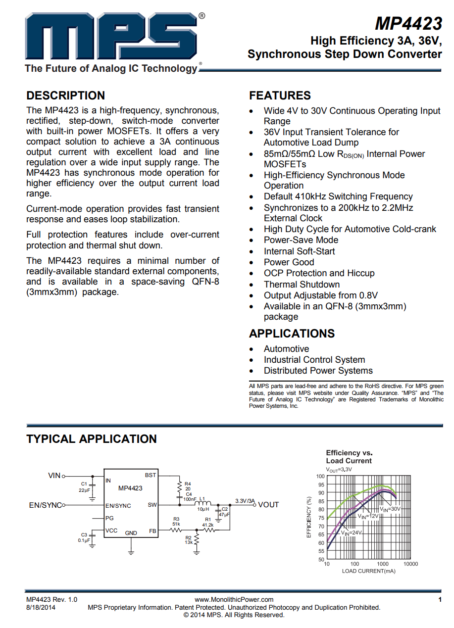 A口输出降压转换器特写,MPSMP4423,高效率同步整流降压转换器。