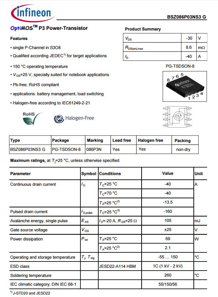 英飞凌BSZ086P03NS3G资料信息。