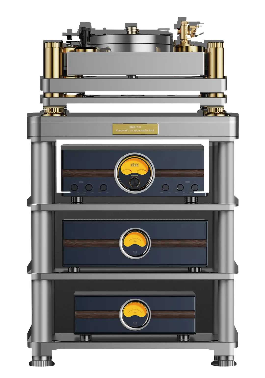 2.多层物理避震结构,多层弹簧钢板+钢丝悬挂构成了第一级避震方式,脚钉采用了一点式接触的氮化硅球做第二次避震,配合专用的德国产空气气囊平台形成三次避震,针对外界震动频率在5HZ-8000HZ可以隔离掉95%,从而保证了唱机工作的背景安静度和超低的抖动率;