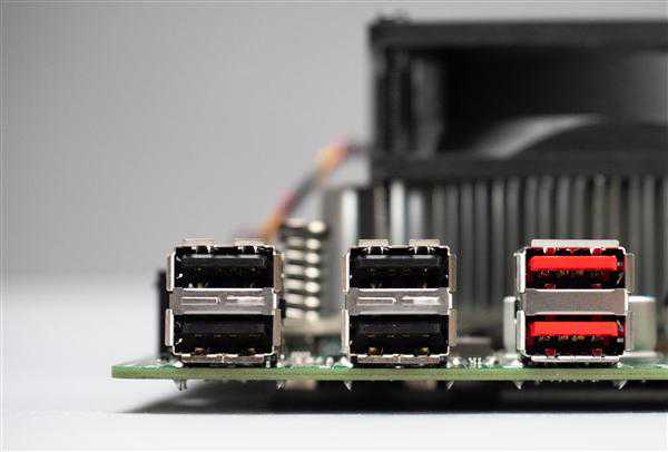 板子上还有一条扩展插槽,两个SATA接口,背部有四个、四个、一个千兆网口、三个音频口。