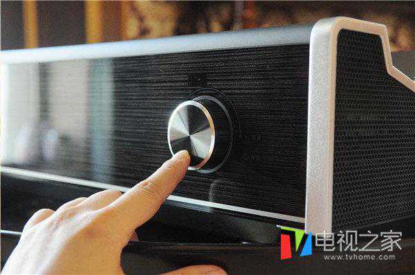 艾洛维VH710的镜面玻璃设计,内有条状拉丝纹理。左侧为产品logo及产品特点,右侧则为电源/音量调节旋钮,开机后,会出现一条蓝色的光圈。