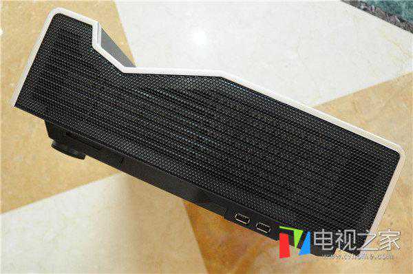 侧面为蜂巢式散热,在右侧网罩的下部,还有一个调焦滑钮和两个USB接口,再不挪动机身的情况下,大大增加了使用的便捷性。
