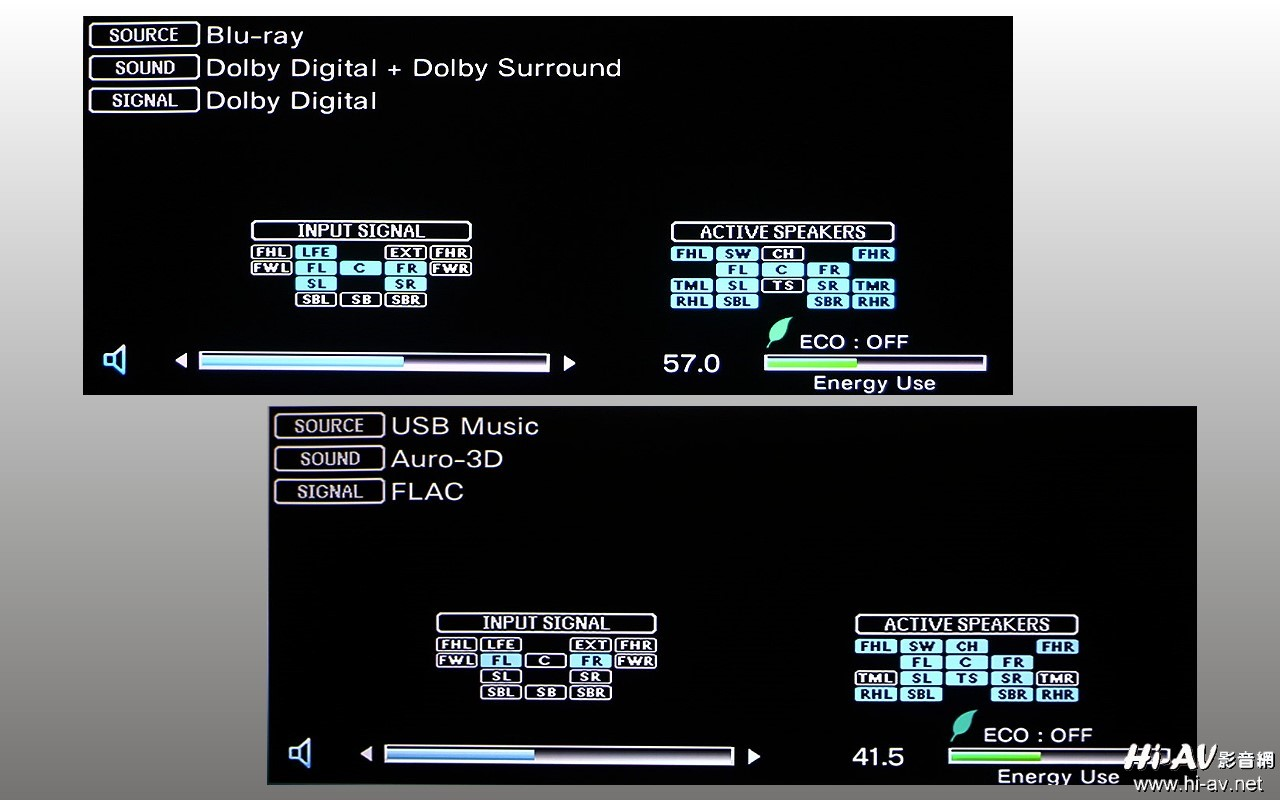 理由上面已经说过了,那是由于在不同音效模式时,DenonAVR-X8500H最多同时都只能有13.1声道喇叭发声的关系。请看上图左上图片的右半部,当DolbyAtmos、DTS:X(或其他Dolby及DTS音效格式)时,本机此15.1声道的喇叭配置会以7.1.6方式发声(Auro-3D的「上方中央声道」及「上帝之声」没有声音);倘若切换到Auro-3D模式呢?(请见上图右下图片的右半部)「上方中央声道」及「上帝之声」此时开声了,但DolbyAtmos/DTS:X三对「天空喇叭」里中间的TopMiddle由于不在Auro-3D的喇叭位置规范上,这对TopMiddle喇叭就不会发声了,因此总计还是13.1声道发声。
