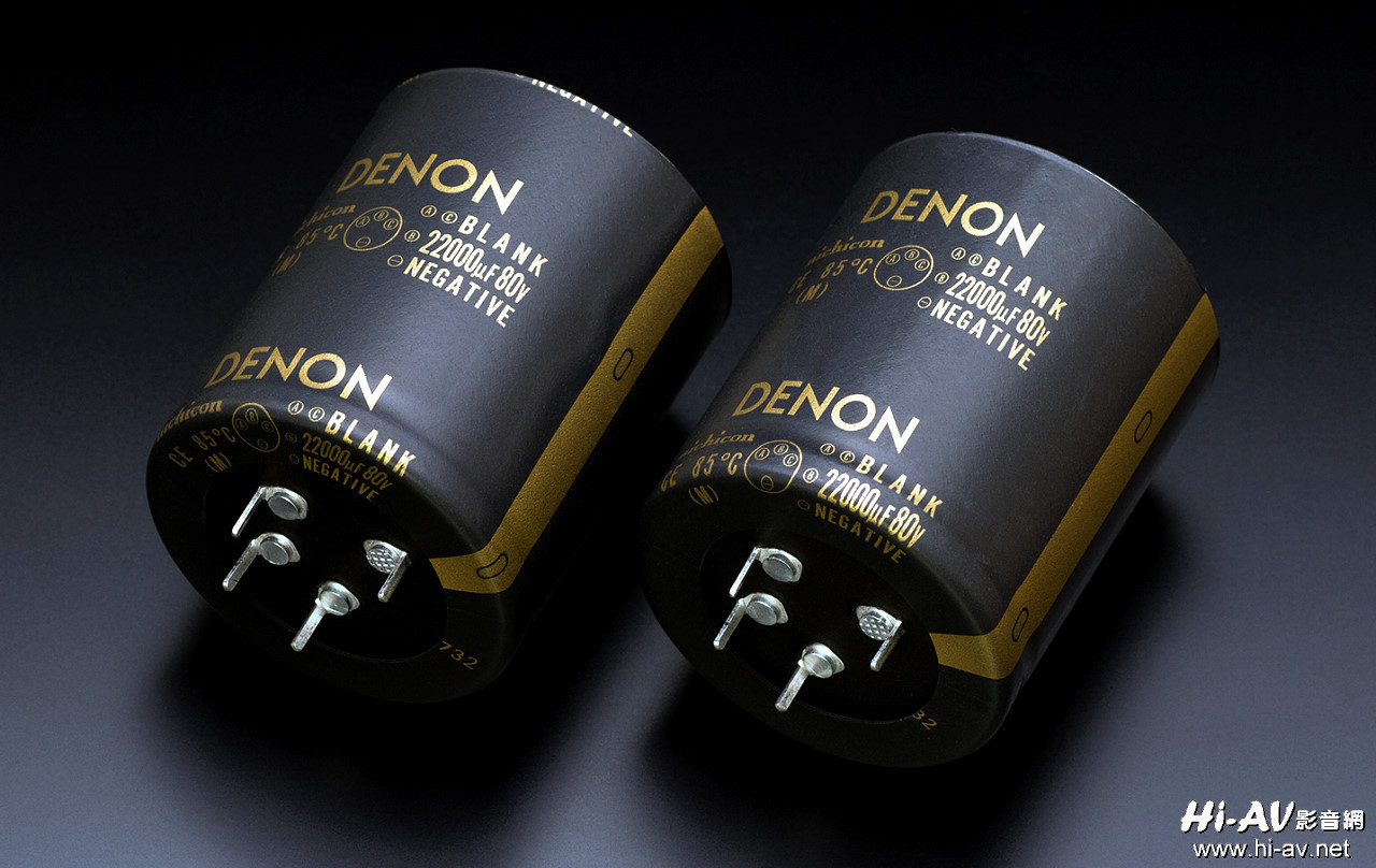 这是本机的主滤波电容,每颗容量高达22,000㎌/80V,这是Denon特别订制的,体型比一般电源滤波电容大了不少。为了让这两颗滤波电容能够「站」得更稳、更不受外界震动之影响,在原本正负两支接脚之外,还特别另外增加了两支「空脚」,这也是相当少见的作法。