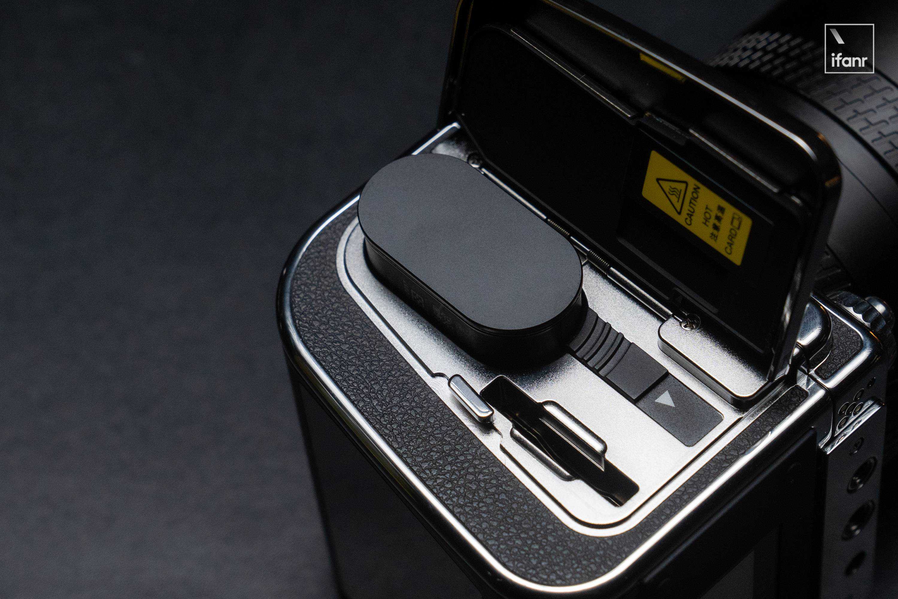 电池仓和储存卡槽放在了机身右侧的盖板内,电池是X2D100C的同款3400mAh的电池,卡槽则从CFVII50C的双UHS-IISD卡槽变成了单个CFExpressTypeB卡槽。盖板用了带弹簧的滑动开关结构,开关方便,打开的时候也不会出现防尘盖乱放的情况,破坏了机身的优雅。