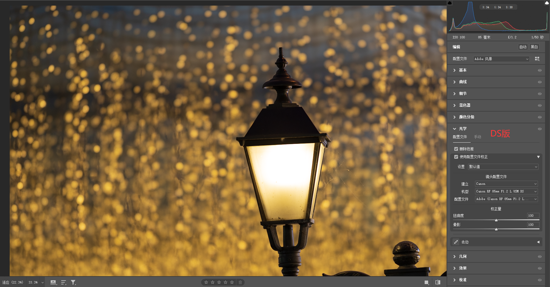 有人说,DS版是专为夜景而生。所以,特地找了一个圆形光斑背景的场景来对比。