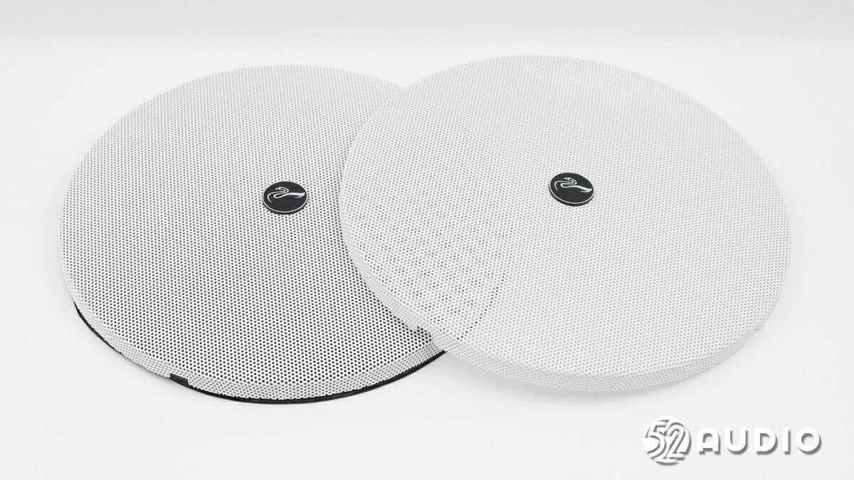 HiVi惠威CQ6-BT蓝牙吸顶喇叭正面外观一览,包括主扬声器和副扬声器两个单元,均采用了高强度云母碳化聚丙烯振膜,高损耗耐疲劳橡胶折环,提供更持久的使用寿命;中间设置有天然丝振膜球顶负责中高音,采用航天级磁液冷却,功率承受能力强。
