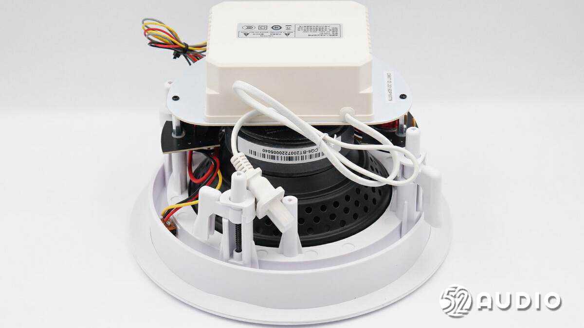 惠威CQ6-BT蓝牙吸顶喇叭包括主扬声器和副扬声器两个单元,喇叭采用了高强度云母碳化聚丙烯振膜+天然丝振膜球顶,分别负责中高低音频;主扬声器搭载蓝牙功放模块,支持多台同步使用,支持多种音乐格式,提供高保真无损音质传输。模块内部设置有两块PCB板,通过插座连接,电源输入板通过黑色绝缘片隔离防护。