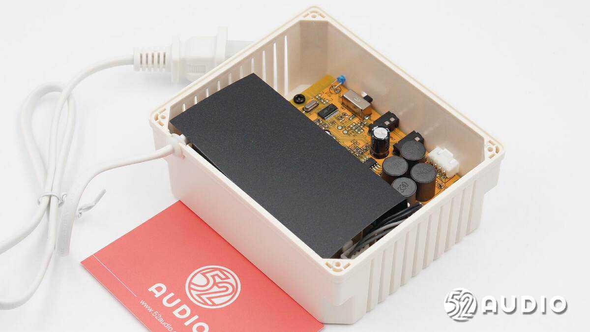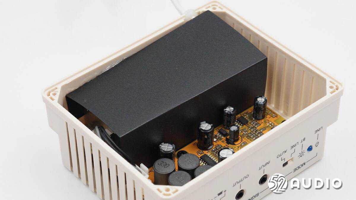 卸掉螺丝,取掉盖板,腔体内部结构一览,设置有电源输入模块和蓝牙功放PCB板。