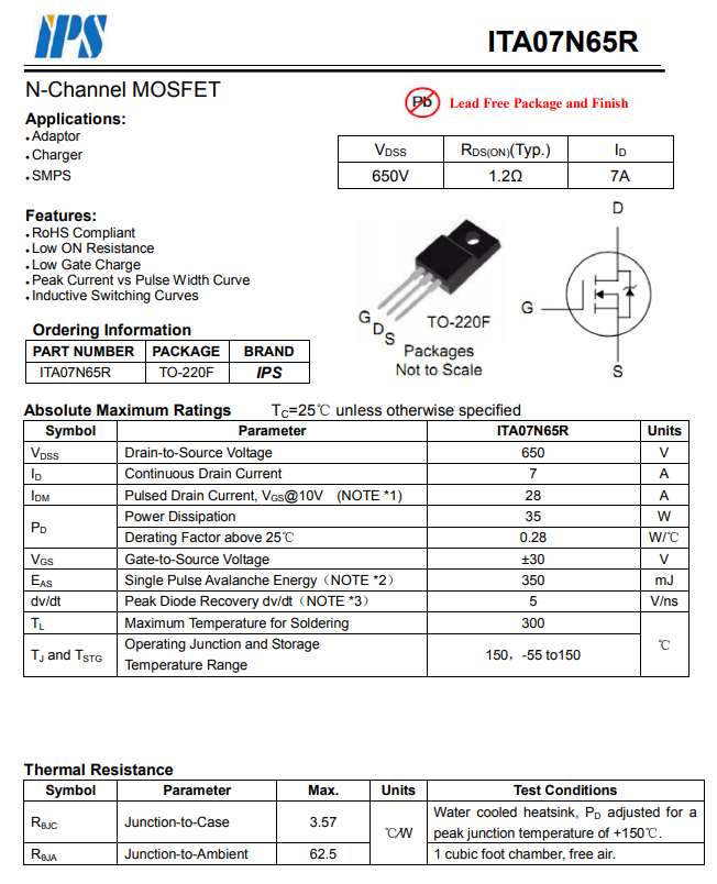 IPS华润芯ITA07N65R详细资料图。