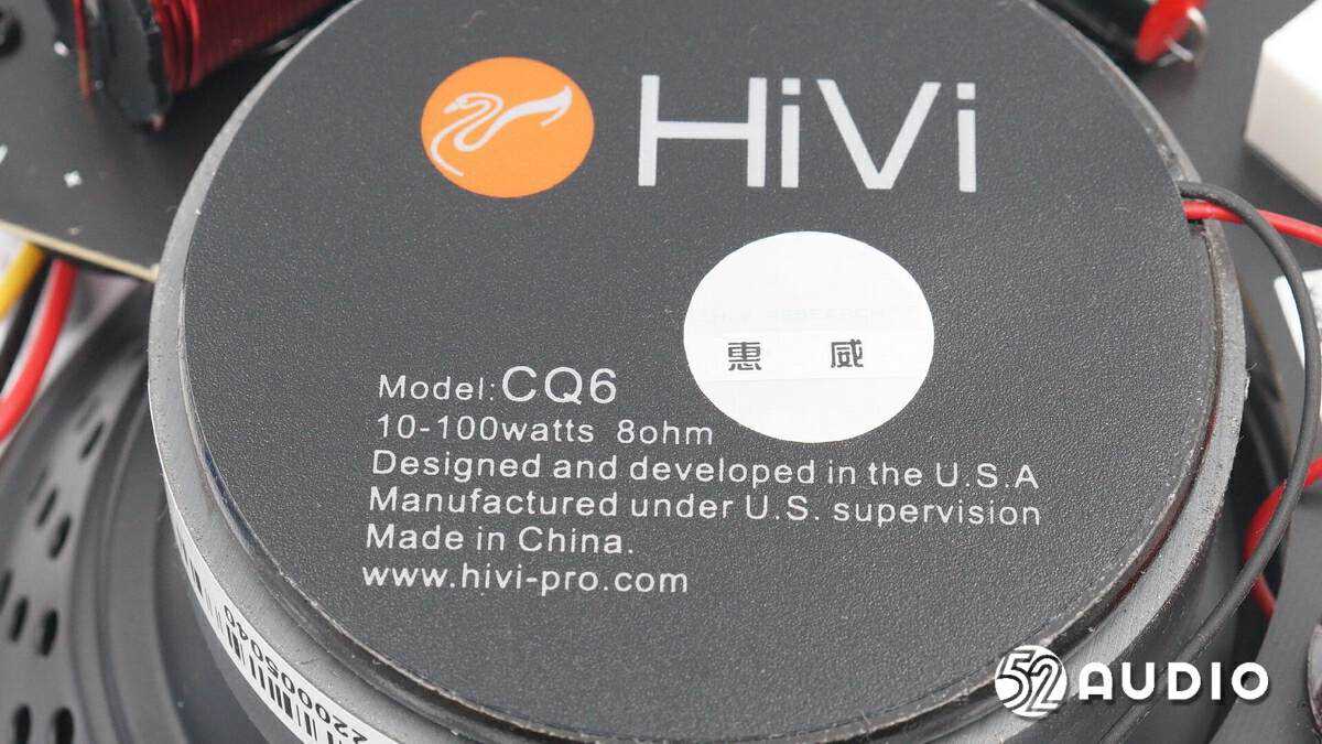 扬声器T铁上标签信息一览,型号:CQ6,功放功率:10-100Watts,阻抗:8ohm,在美国设计开发,中国制造。