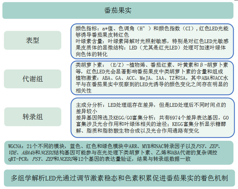 本研究发现LED光(尤其是红色LED光)在促进叶绿素降解、刺激类胡萝卜素生物合成、加速叶绿体到色质体的转化以及提高内源植物激素的合成等方面起着重要作用,这些作用共同导致番茄果实颜色转化的显著加速。转录组和代谢组联合分析鉴定了对LED照射果实着色做出响应的关键转录因子和结构基因(和等),它们调节类胡萝卜素、乙烯和ABA的代谢,因此直接影响果实着色。