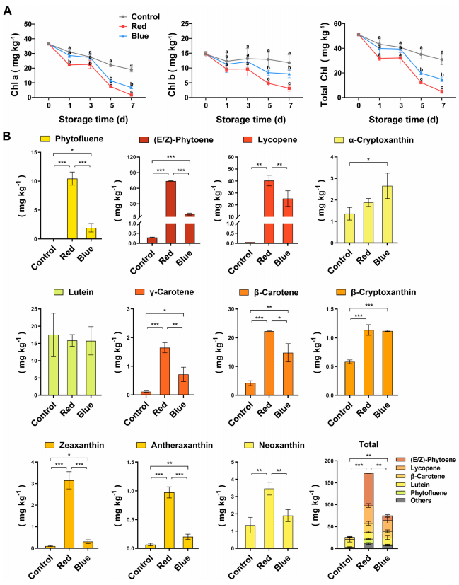 为了了解光照对叶绿素降解的影响,作者对番茄贮藏过程中果皮的叶绿素含量进行检测,结果表明在整个贮藏过程中,番茄果皮中的叶绿素含量逐渐下降。贮藏7天后,红色LED照射的番茄果实总叶绿素含量显著低于蓝色LED和未处理组,对叶绿素a和叶绿素b分别检测的结果也与总叶绿素变化一致(图2A)。表明叶绿素降解对光照射敏感,特别是对红色LED光敏感。