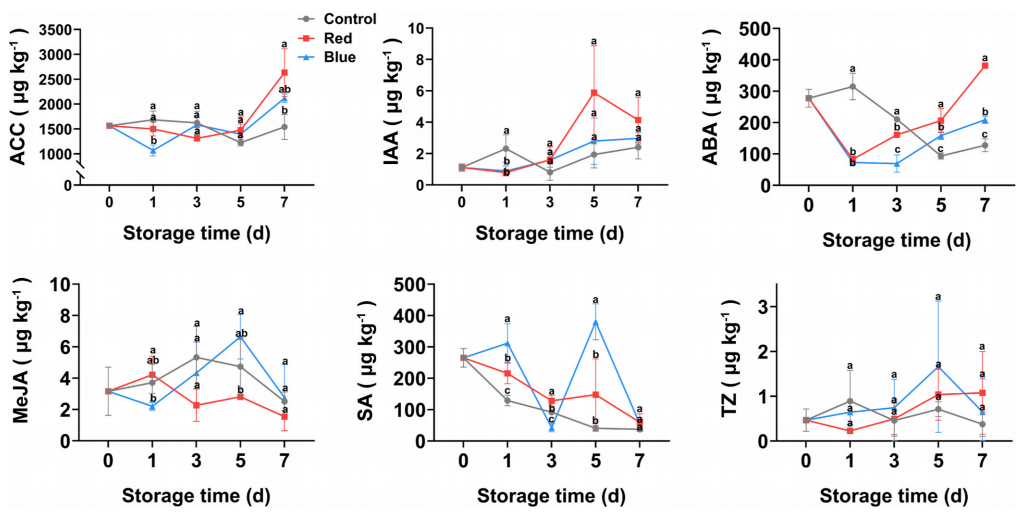 为了研究LED是否以及如何影响植物激素的变化,作者对番茄果皮在贮藏0、1、3、5和7天后的内源激素水平进行检测包括脱落酸(ABA)、赤霉素(GA)、乙烯前体,1-氨基环丙烷羧酸(ACC)、茉莉酸甲酯(MeJA)、吲哚乙酸(IAA)、反式玉米素(TZ)和水杨酸(SA)。研究结果表明,IAA、MeJA和TZ在LED光处理番茄果实和对照番茄果实中都维持在较低水平,不超过10μgkg,SA在蓝光照射过程中表现出剧烈波动,这可能是果实在蓝光照射下为维持生理平衡而做出的适应性反应,7天时,类胡萝卜素代谢的下游代谢产物ABA在暴露于红色LED光的番茄果皮中的浓度(381.42μgkgFW)明显高于暴露于蓝色LED光的番茄(208.77μgkgFW)和对照(127.58μgkgFW)。这些结果表明,激素(如ABA和ACC)水平与在番茄果实中观察到的LED光诱导的颜色变化之间存在明显的相关性(图4)。
