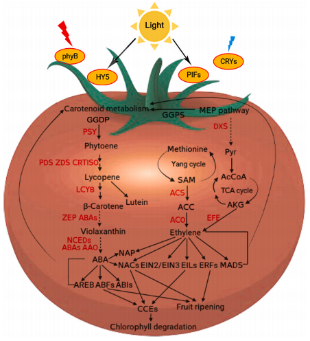 图8光信号和植物激素在调控番茄果实胡萝卜素生成过程中相互作用模型