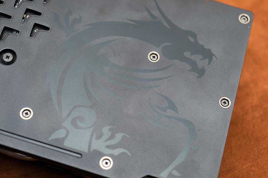 三明治式的背板(说到背板这个词,似乎英文Plate翻译成护甲更贴切),包括保护后方电路板的雕龙背板和给VRM显存散热的正面Plate,因为是正面,所以无论如何叫做“背”板都应该是不妥的。