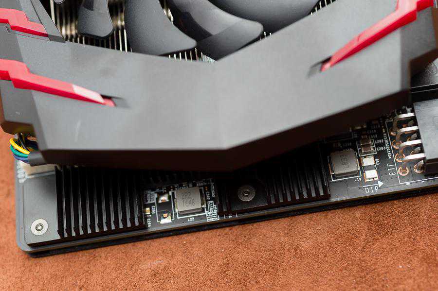 主板正面的VRM供电散热片下面,MOSFET采用一上两下桥接结构,具体型号为ONSemiconductor(安森美)的4C024和4C029。除此之外,还有“Ti”标记的钛金电感器和配套的Hi-C聚合物电容器,用于滤波12VDC输入主板VRM供电。