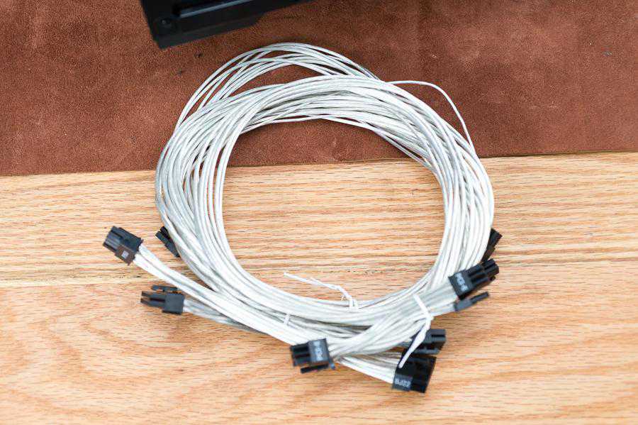 官方模组线分量非常足,我算算给了5根显卡PCIe线足够玩4卡的——3根(6+2)x2,2根的6+2,3根SATA,2根Molex大D口,CPU4+4p和MB20+4p各只给了一根,其实一般主板能插3卡就顶天了,不少X99主板还是双CPU8p的,需要增加一根CPU8p接口。