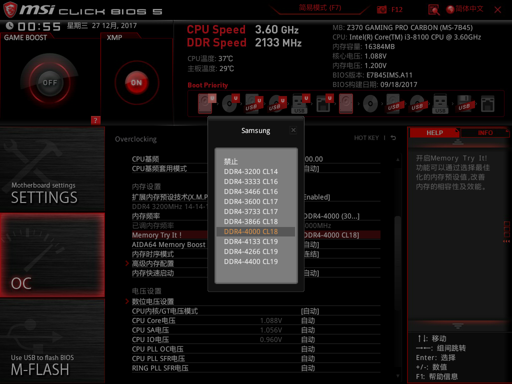 微星Z370主板支持内存MemoryTryIt一键超频,根据内存颗粒类型进行选择,所以必须要知道自己的内存颗粒。