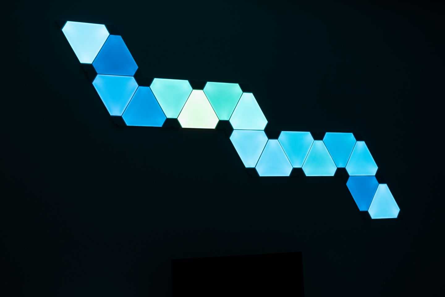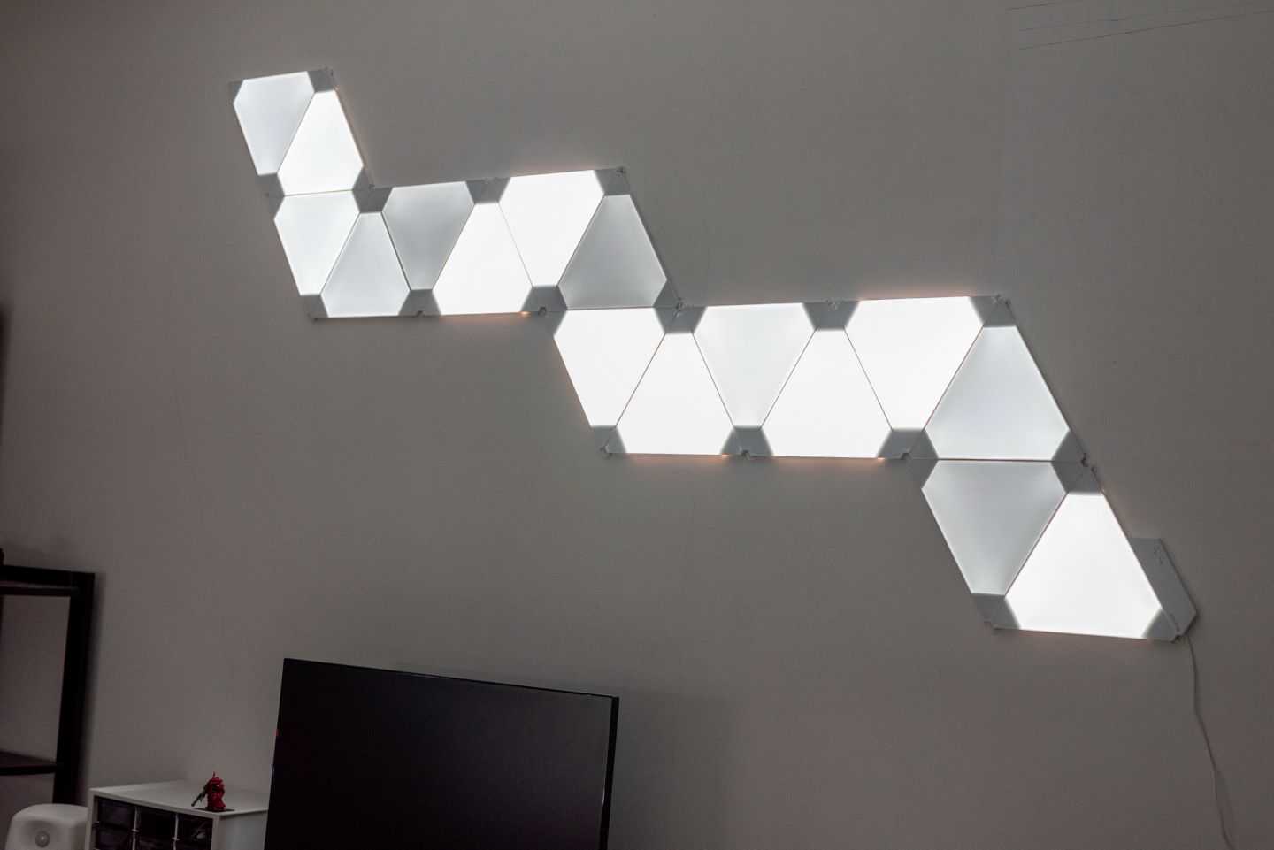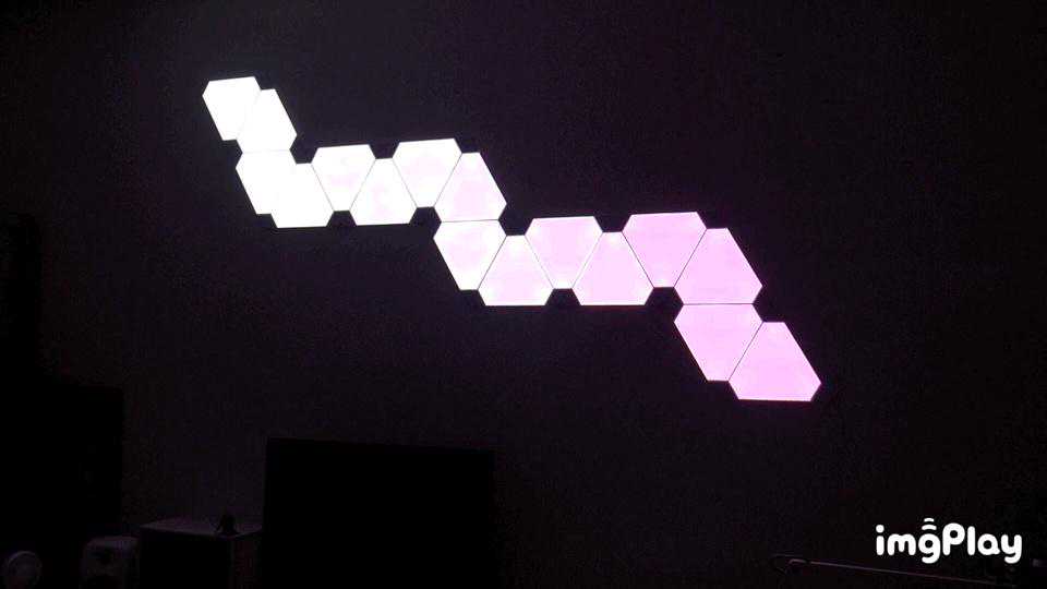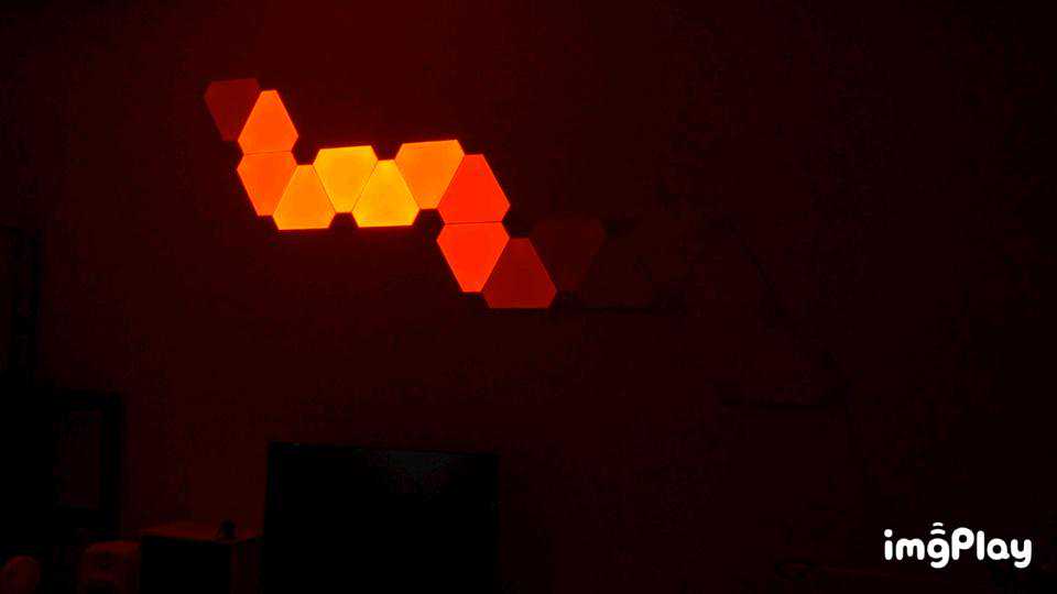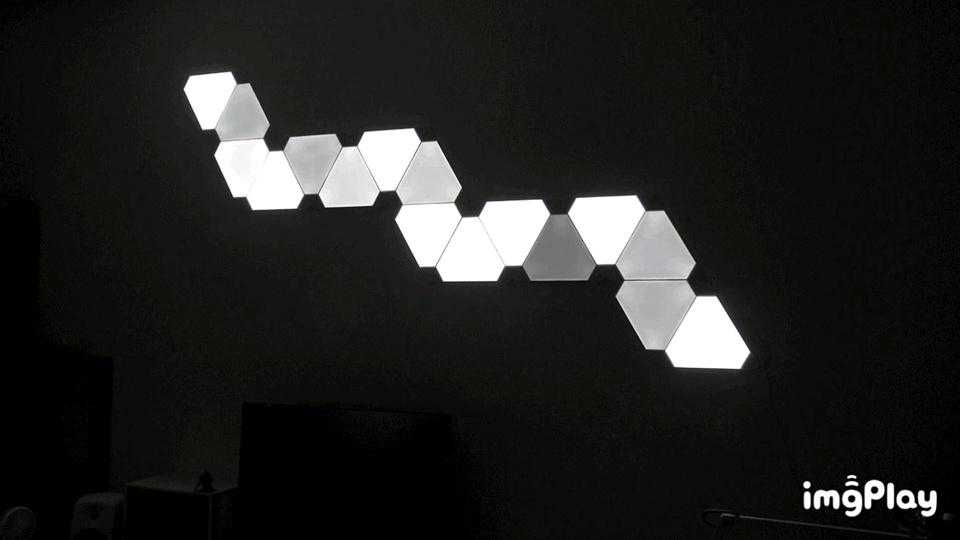 昨天花了一个晚上时间折腾安装,装好之后感觉,难怪会成为“油管网红产品”,玩起来确实挺有意思。其实Nanoleaf这个更偏向一个加强版的氛围灯,除了可以联网用APP加载各种线上的灯控方案以外,搭配妙音器之后会根据环境音(或者音源)自动控制光线的律动,而且它的律动还不是简单的律动,是根据不同声音会有不同的效果,如果只是简单的“RGB"的话确实没什么,搭配妙音器之后,比如看电影、游戏、家里的音乐排队,各种灯效确实非常好玩。我这边简单拍了几个示意。