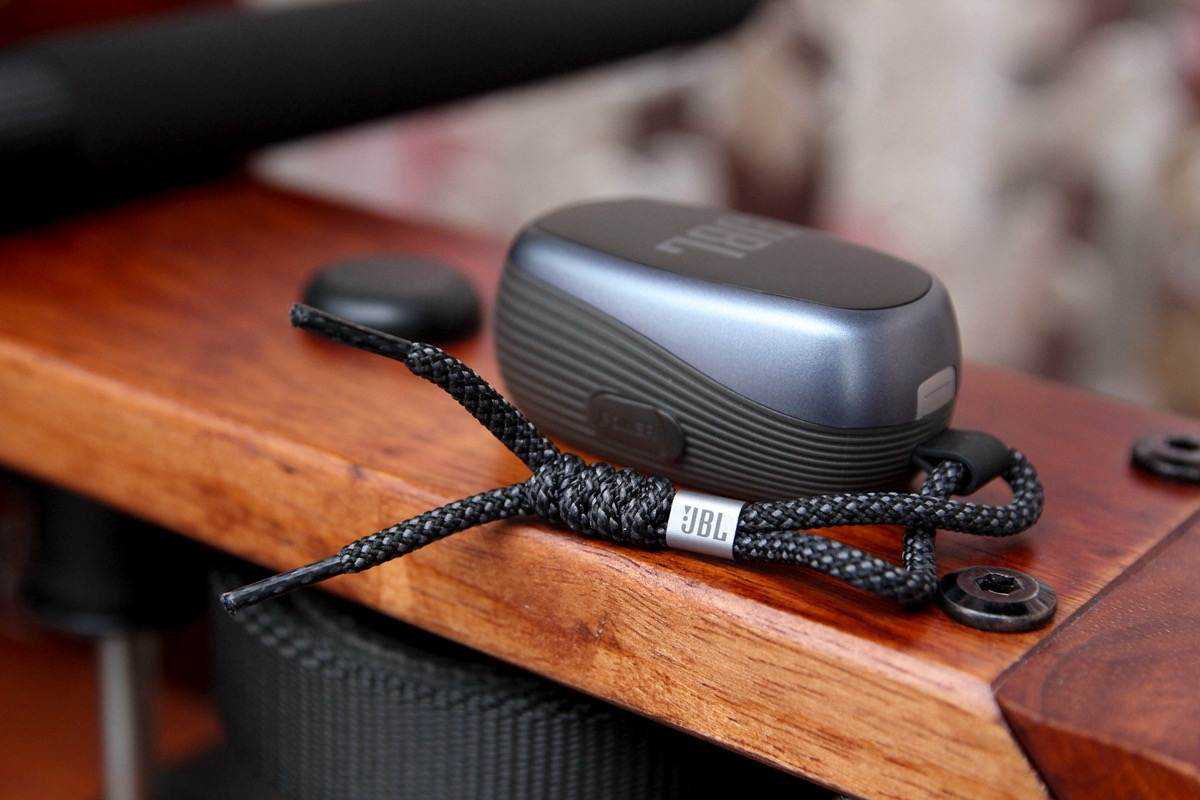 耳机的收纳盒采用的是收纳+充电一体化的组合,设计上采用了撞色设计,亮面黑的地方为塑料材质,带有螺纹质感的部分为硅胶材质,在手感方面非常舒服,而且还配备了一条便携绳,运动风十足。