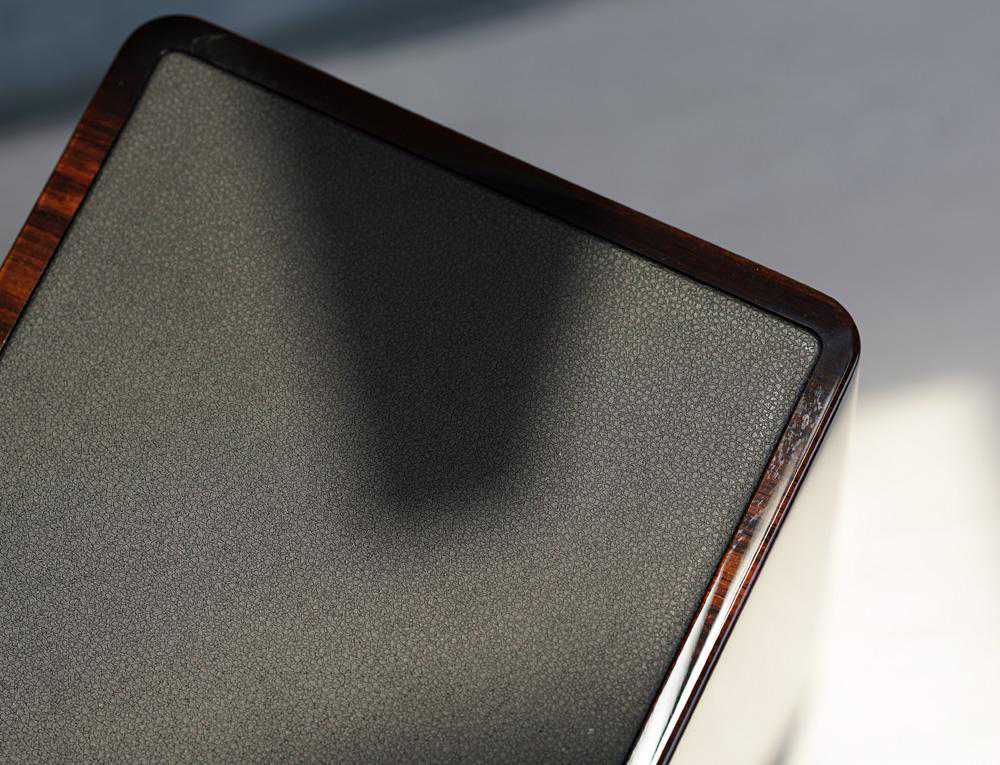 外层的饰面木皮是来自苏格兰的实木黑檀木皮,在声音上做好了AB配对之后,再贴木皮,最外外观上的左右配对,所以工艺非常复杂。
