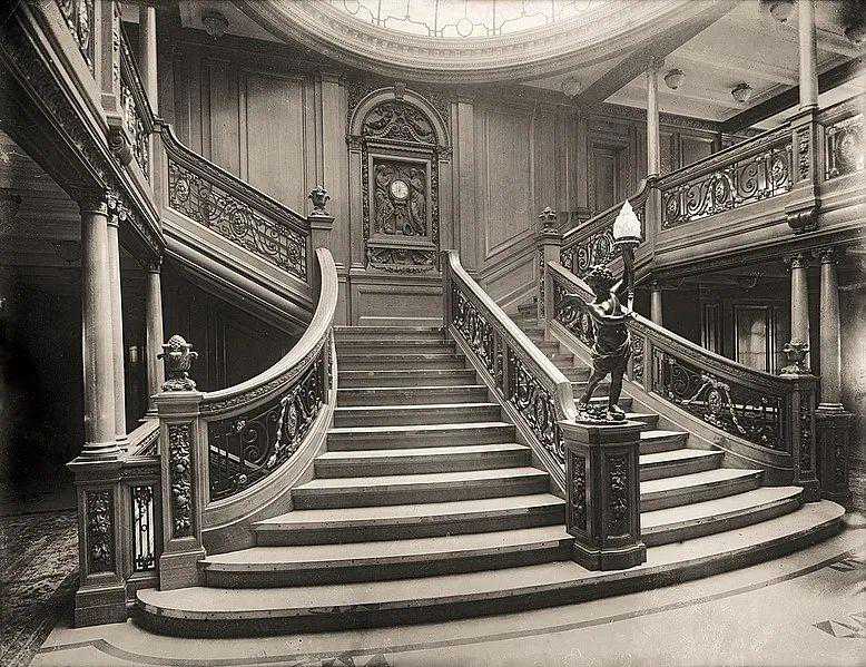 泰坦尼克号的姊妹船——皇家邮轮奥林匹克号上的大楼梯,这个楼梯和泰坦尼克号上的很相似。图/wiki