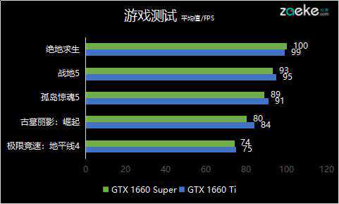测试结果基本重现了理论性能测试,这张索泰GTX1660SuperX-GAMING与GTX1660Ti在大部分游戏中仅有1%~2%的差距,几乎可以忽略不计;在《古墓丽影:崛起》中的帧数差距最大也仅有4%,在《绝地求生》中表现则基本一致。