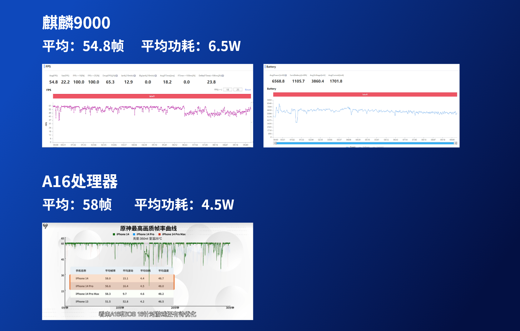 第三部分:功耗,实际表现关于A16目前还没有比较明晰的功耗测试报告,所以我们只能使用运行《原神》时两款SOC的功耗表现来进行对比,同时也可以看看这两款SOC在同样长时间高负载场景下的总体稳定性表现。