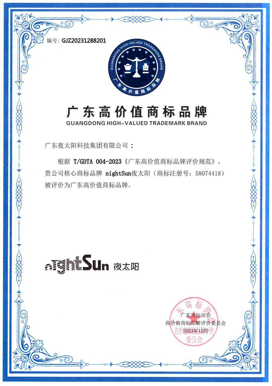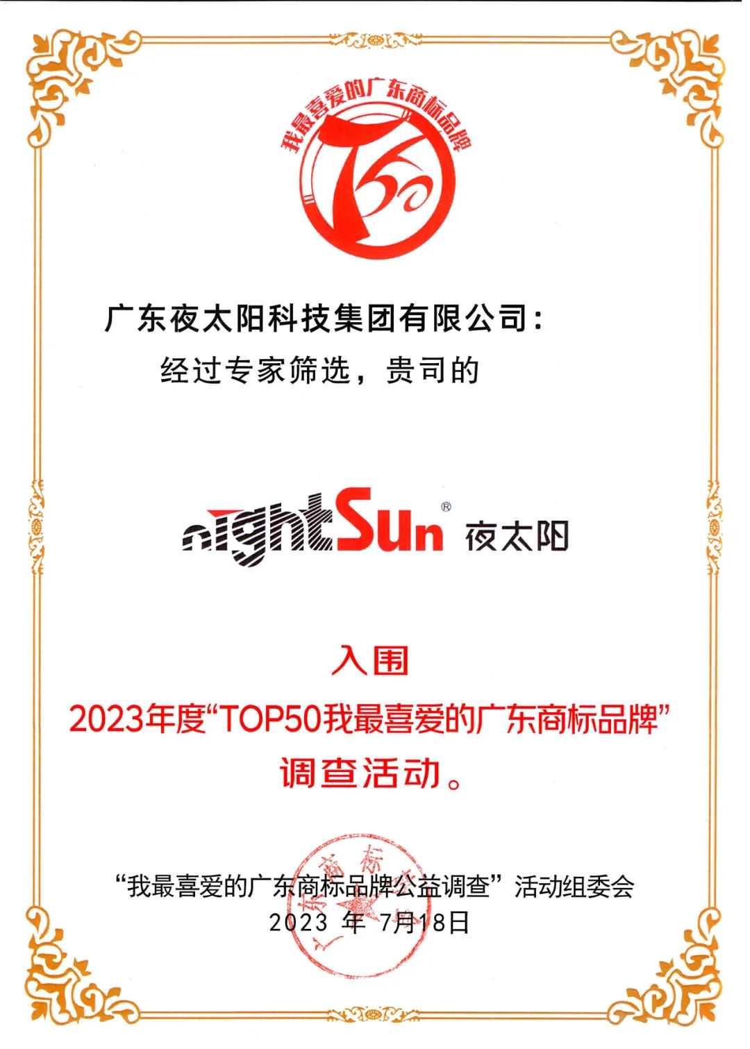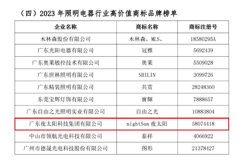 2023年7-9月,夜太阳分别参加了有关商标的两项重要评选:首先是由广东商标协会联合广东财经大学以及相关行业(专业)协会、市(区)商标协会等单位组织举办的“2023我最喜爱的广东商标品牌TOP100”评选;其次是参与了由广东省市场监督管理局指导、广东商标协会和广东省照明电器协会主办的“广东省照明行业高价值商标品牌”申报,在2023年接近尾声的时候,“双双入选”的喜讯传来,在“2023广东商标品牌年会暨成果发布”活动上,两项商标届最有分量的证书的颁发,为夜太阳的2024年开了一个奋进好兆头。
