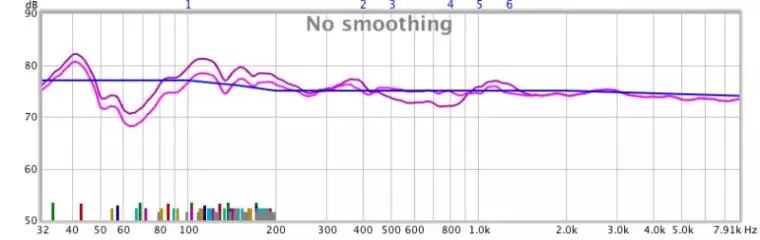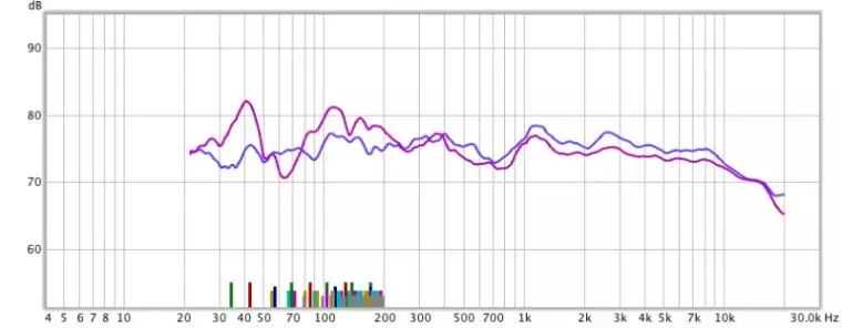 我们想知道的其中一个答案,就是是使用0dB位置的所有PEQ滤波器,并且关闭EQ之后(称为YPAO直通)来进行手动测量均衡,这样可以让我们了解IRF滤波器在做什么。您就会注意到不同之处,这是YPAORSC应用的第一层过滤器。下图说明了差异。中央扬声器的测量结果均未使用EQ(粉红线),手动设置时所有EQ滤波器都设置为0dB,只有IRF滤波器处于活动状态(较暗的紫色线)。您可以看到,紫色线条更平滑,尤其是在YPAORSC最活跃的80Hz至500Hz范围内。忽略低音炮测量(低于80Hz)。