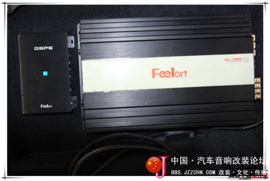 做主动两分频搭配的功放是芬朗的AL-460四路功放,搭配曼琴的喇叭的功率,用这台功放的功率来推就可以了。四路分别来推曼琴的一对高音和一对中低音。处理器选择芬朗DSP6专业音频处理器,除了品相佳,芬朗DSP的用料和功能也很专业:两进六出设计,可支持高电平、低电平输入,既可与原车主机对插直接使用,加功放也能玩主动,搭配起来相当灵活。