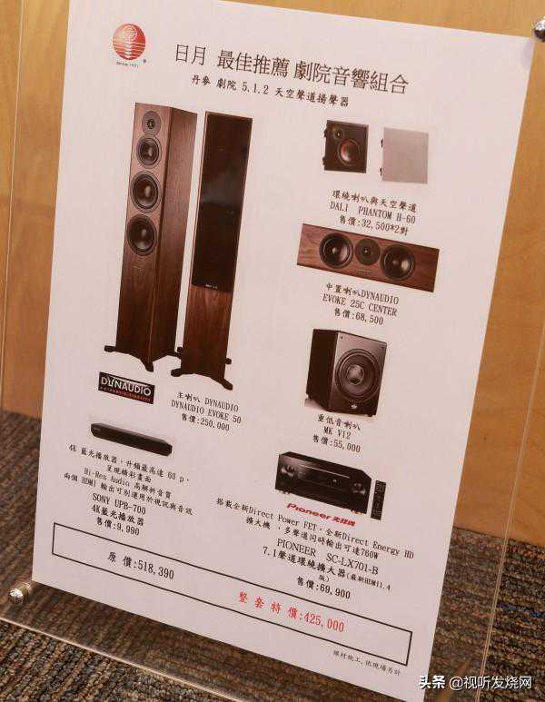 5.1.2声道的配置,日月做了「混搭」,主声道是DynaudioEvoke50,中置声道是Evoke25CCenter,不过后环绕与天空声道,就搭配丹麦DaliPhantom嵌壁式音箱,最不占空间,同时让音箱配线隐身在天花板里面。超低音则是MKV12,而不是搭配Dynaudio,可以让预算再省一点。环绕扩大机搭配PioneerSC-LX701-B,支持7.1声道,配备Pioneer最新DirectPowerFET功率晶体,全功率输出最高达760瓦,HDMI规格支持最新11.4版。蓝光播放器则是SonyUPB-700,支持到4KUHD规格。全套系统定价518,390元,日月特价425,000元,全套器材搭配与售价,全部写在展示间的广告牌上,知道器材价格,又看到立马折扣,口袋里的钱可能就蠢蠢欲动了,果然是「劝败」空间。