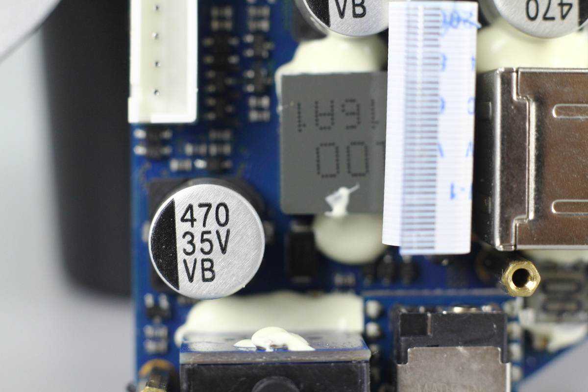 变压器一侧设有两颗输入滤波固态电容,规格都是35V470μF。