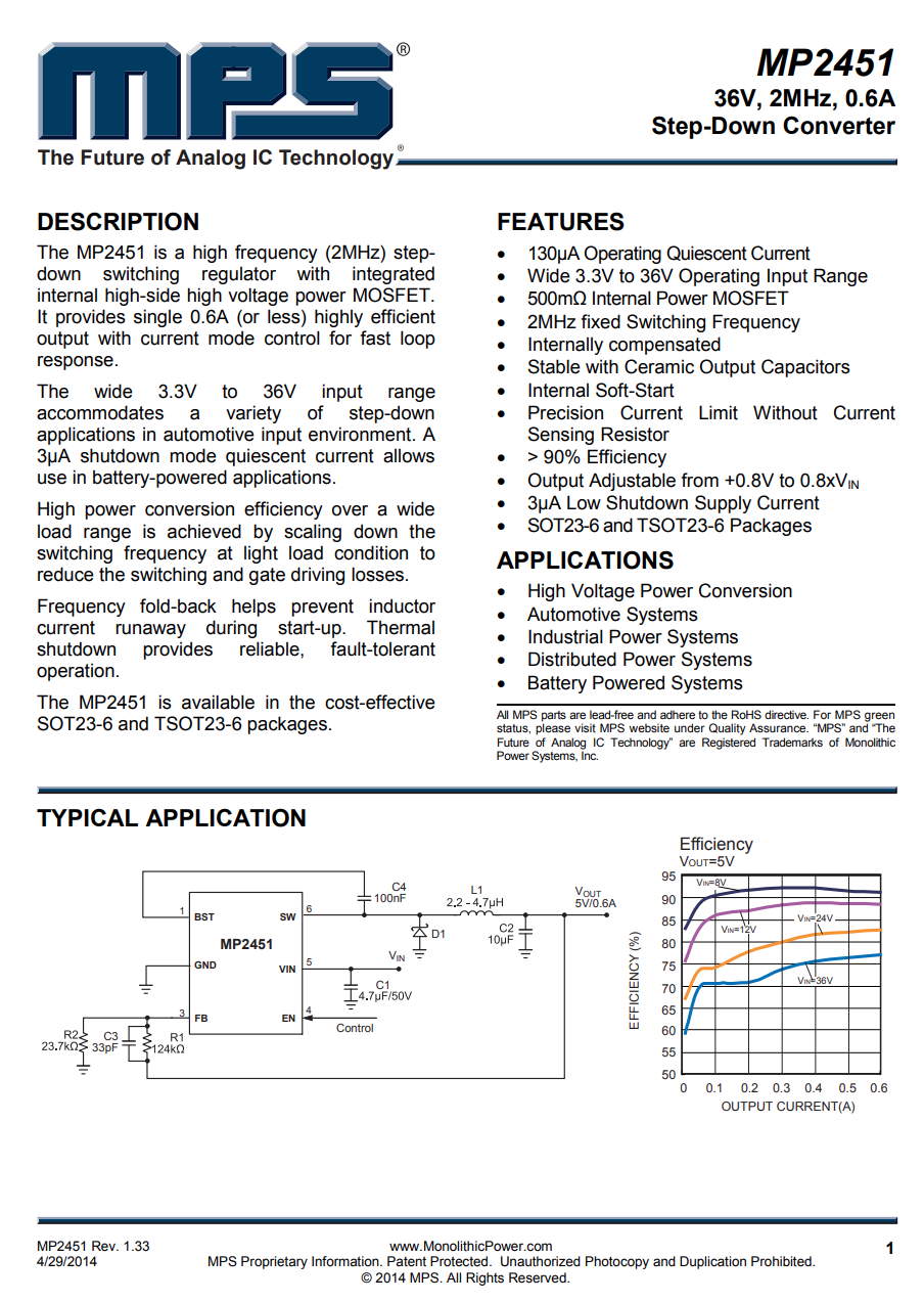 MPSMP245136V输入的降压转换器,内置开关管,用于为MCU供电。
