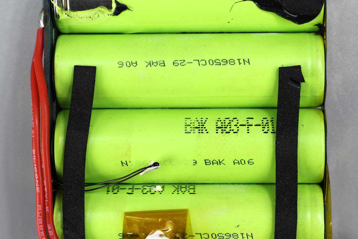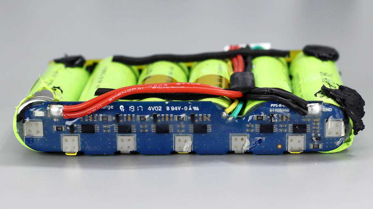 电池和保护电路板镍片点焊连接,PCB板上可以看到六颗相同的保护芯片,整个板子注塑保护。