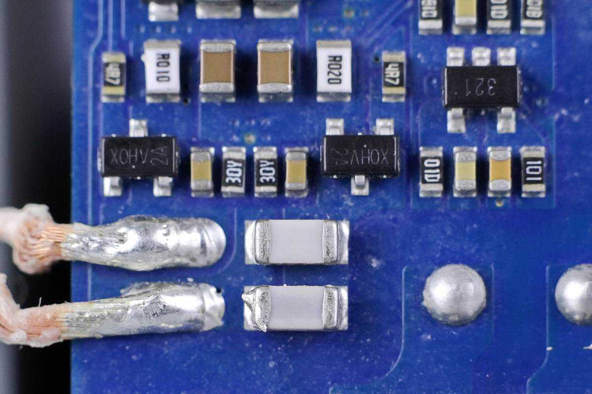两颗NPO谐振电容特写和无线充电功率管特写,无线充电功率管采用SOT23封装。