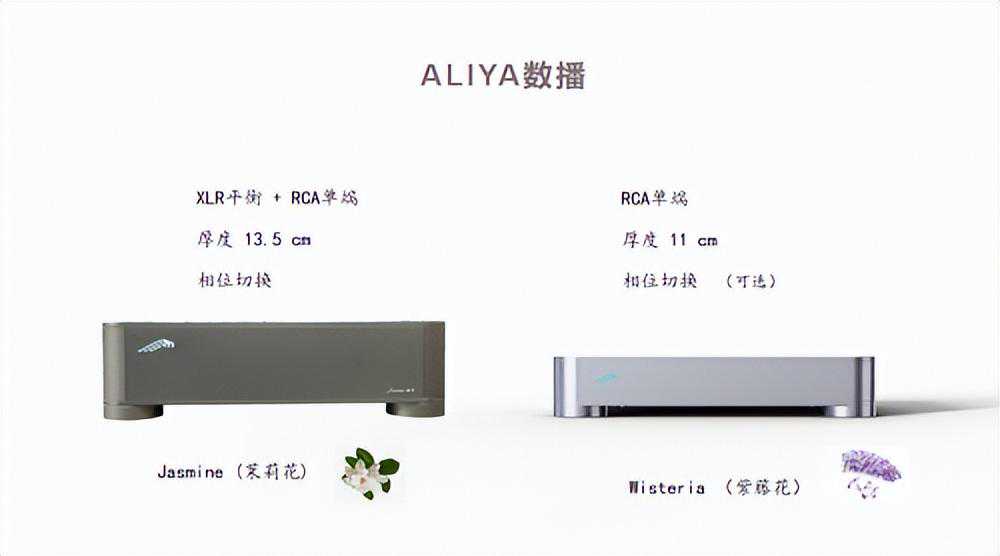Aliya数播目前有Wisteria(紫藤花)和Jasmine(茉莉花)两种型号,它们的主要区别在于单端/平衡、机身厚度和是否标配相位切换这三个方面。其中,Wisteria数播采用的是RCA单端线路架构,而Jasmine数播则注重音质性能,包含RCA单端接口和XLR平衡接口,具备Phase相位切换功能,并配备了两组独立的90瓦线性电源,分别为左右声道解码供电。