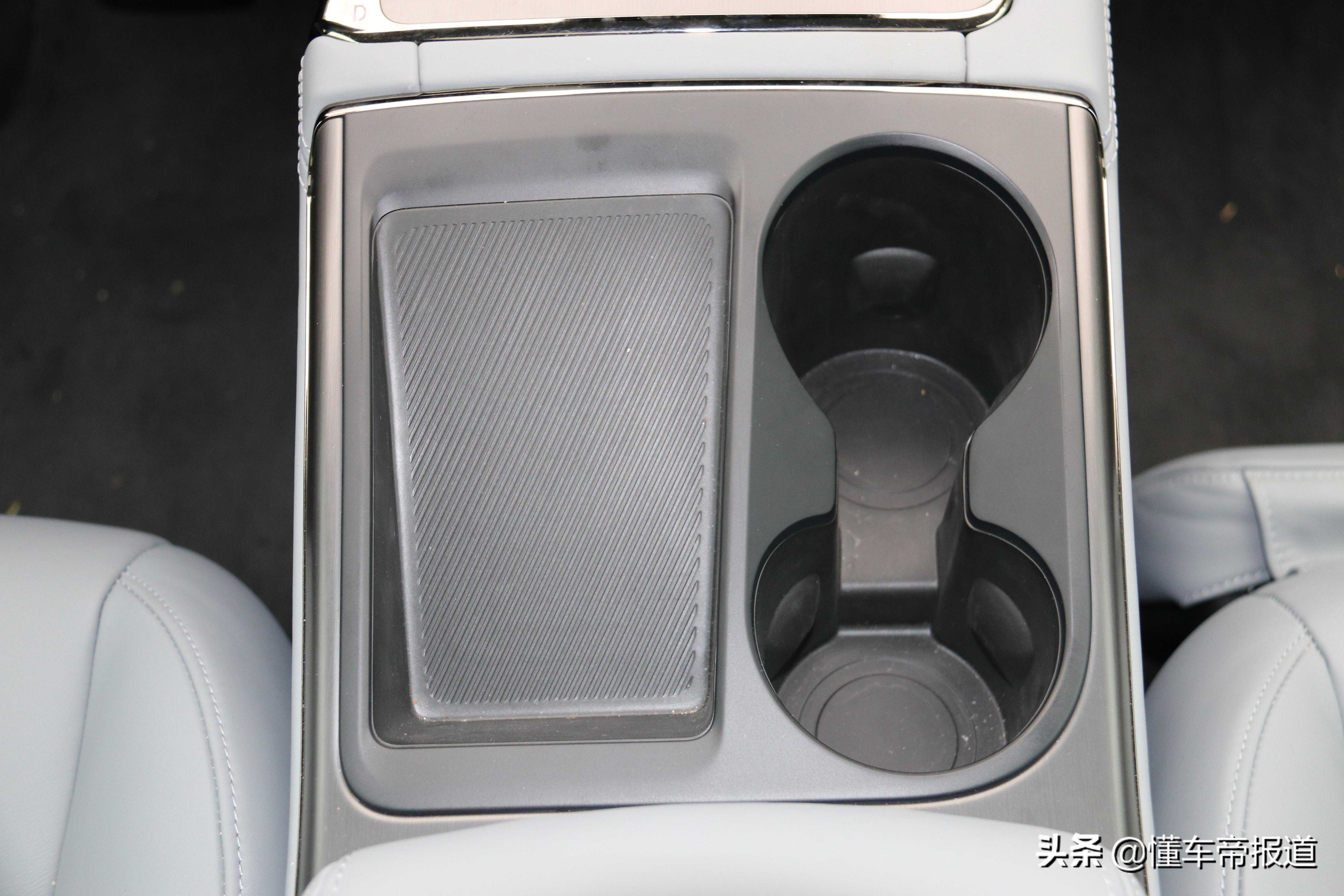 在屏幕下方是物理按键及旋钮,而这也和ES8的按键布局保持一致,整体比较简洁。不过,个人觉得如果把空调控制区也放在这个区域会更好,一定程度上能便于行驶中的盲操作。此外,挡把造型也和ES8保持一致,采用拨动式操作,相比传统燃油车也比较新潮。在其后方为大储物槽,放手机比较不错,还具备无线充电功能。