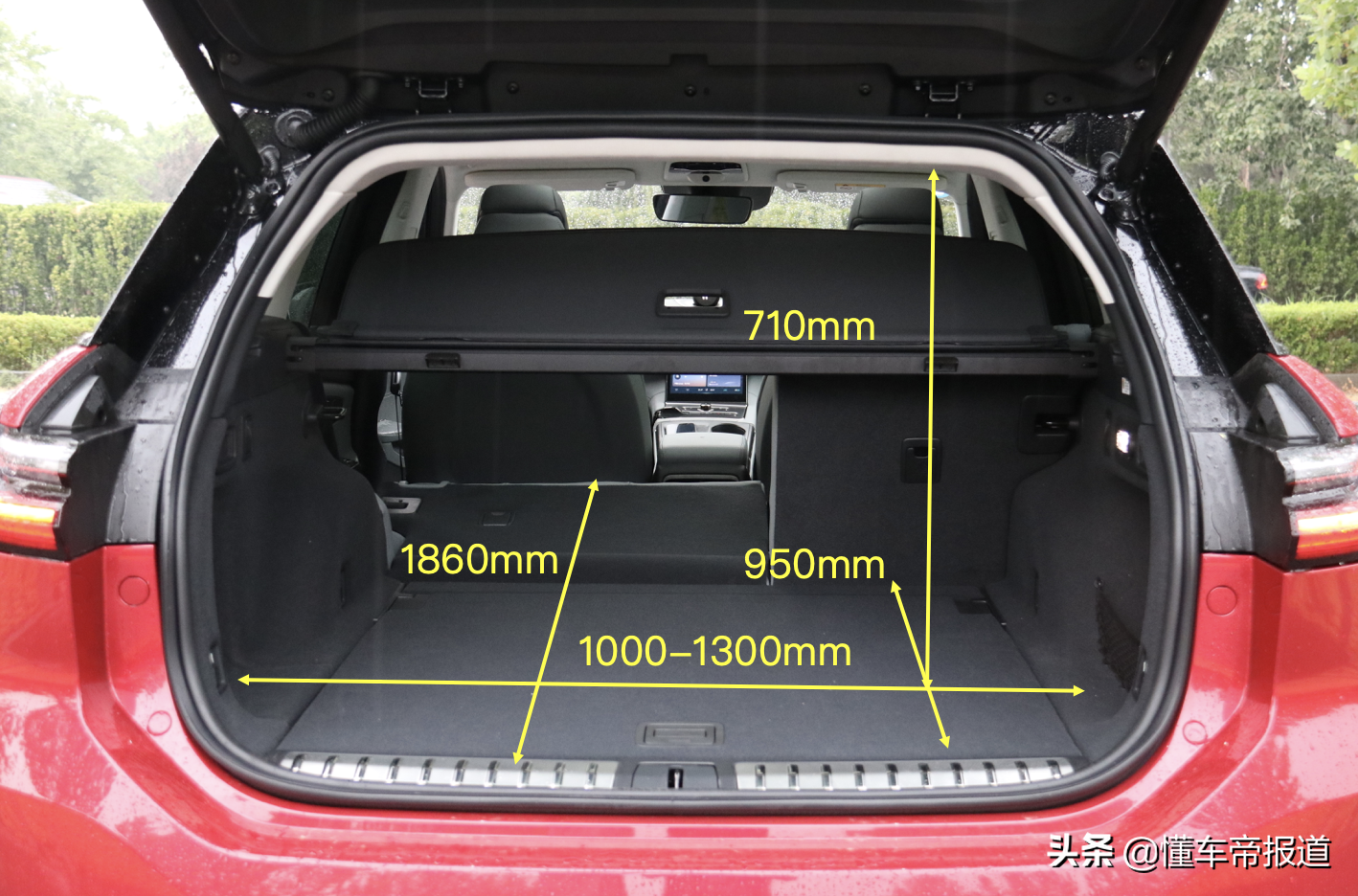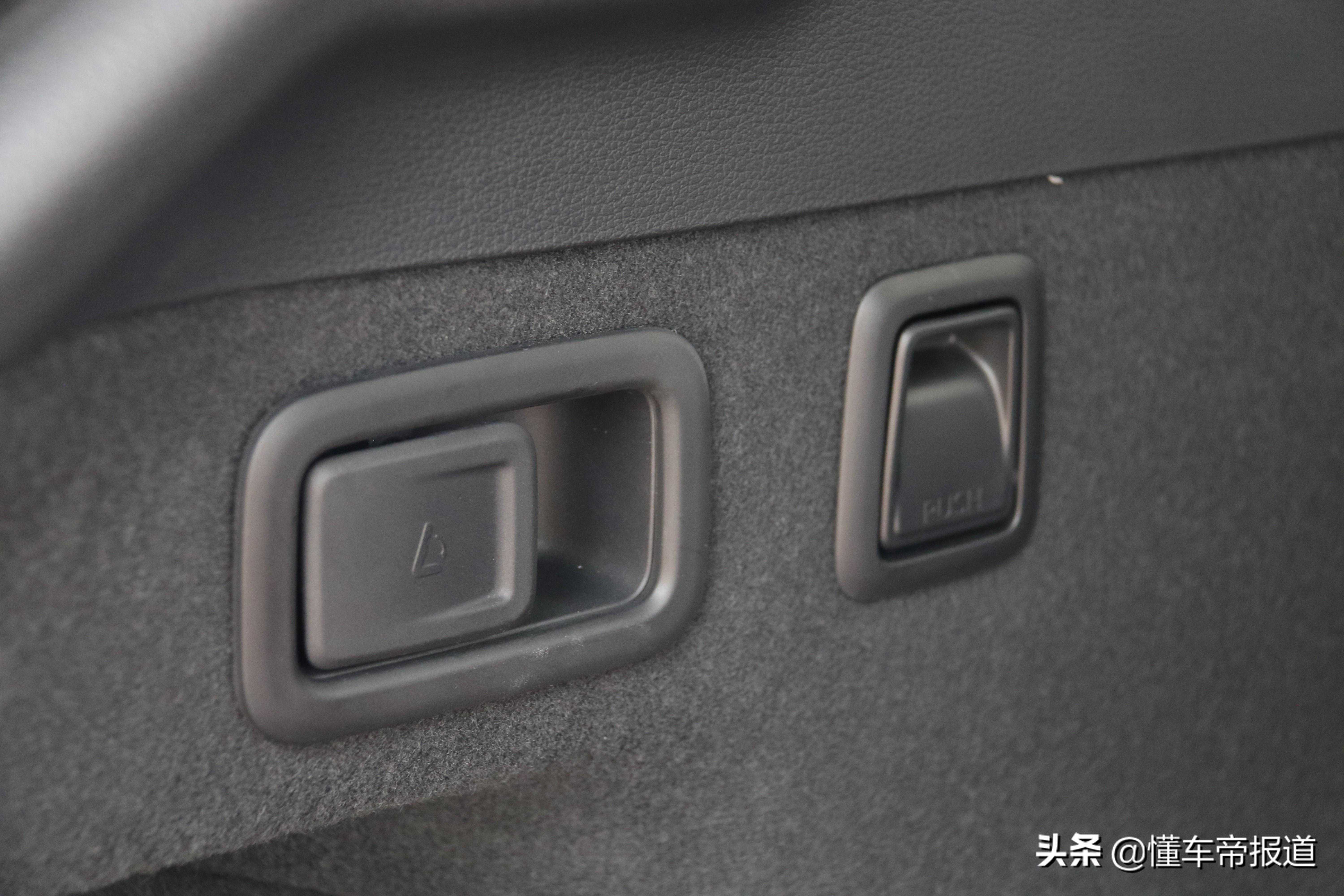 打开后备厢,可以看出它的整个空间表现还是很不错的,其底板很平整,并且这块底板能掀开,保持一定角度倾斜固定。而且第二排座椅可进行4/6比例放倒,放倒后整体空间表现也更大。官方显示其容积为584~1433升,满足日常家用足够。此外,后备厢两侧还配备有挂钩、照明、锚点、电源等配置,更方便日常使用。