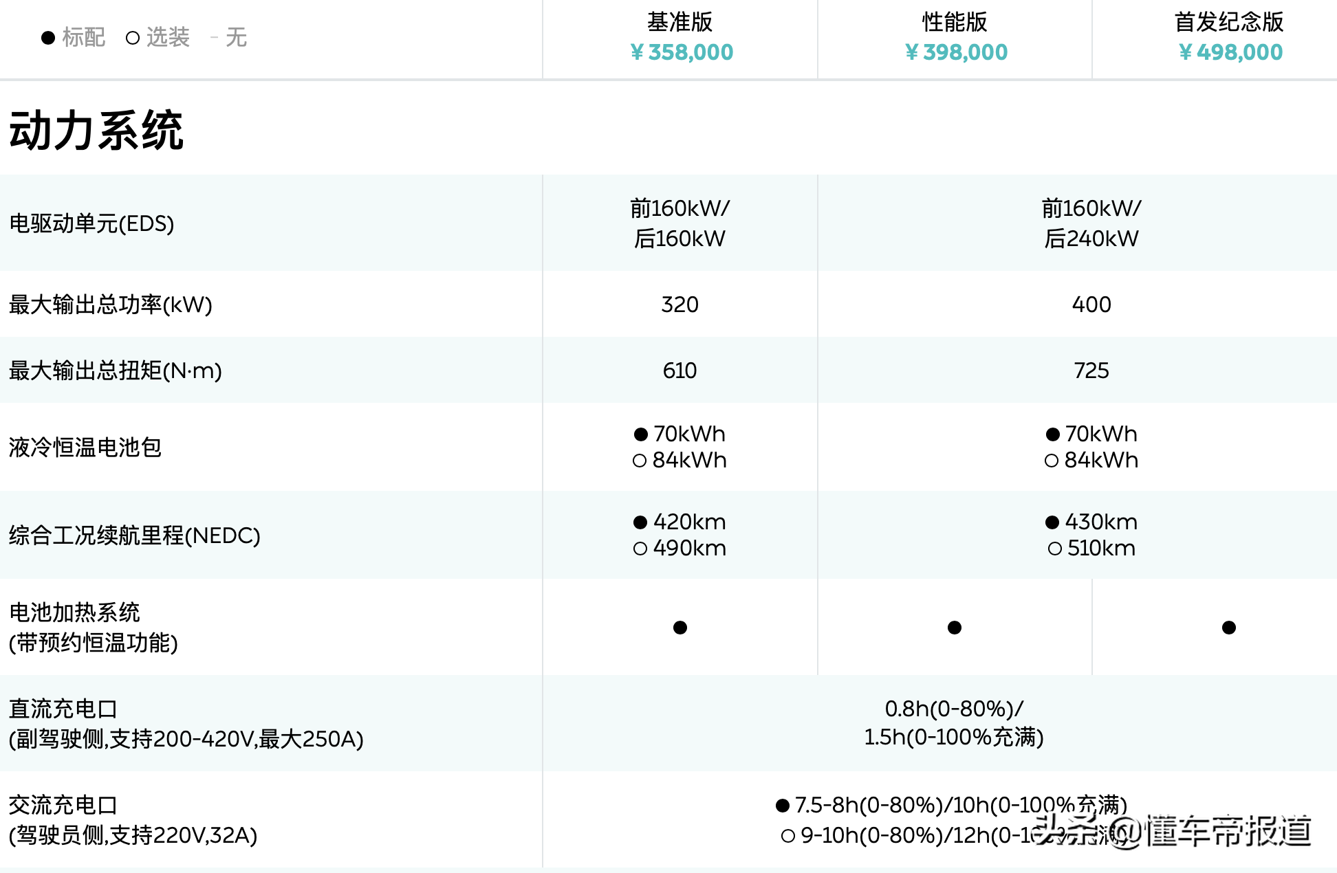 3.除基准版,性能版和首发纪念版都使用了前永磁电机后感应电机