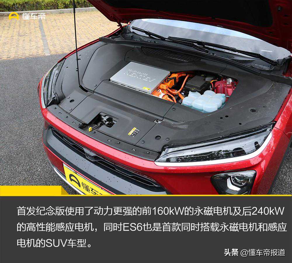 而此次试驾车首发纪念版,所以它使用了动力更强的前160kW的永磁电机及后240kW的高性能感应电机,同时ES6也是首款同时搭载永磁电机和感应电机的SUV车型。其中使用永磁电机的优势就是续航长比较省电,但缺点是动力相对较弱;而感应电机优势是可靠性高、动力强,缺点是耗电相对较高。ES6的用电逻辑是在中低速行驶时,由前面的永磁电机驱动,确保长续航。在高速路行驶时,后部的感应电机也来参与工作,以提供更好的动力输出。这样的好处也显而易见,两者缺点都能实现互补,从而实现性能和续航的平衡。