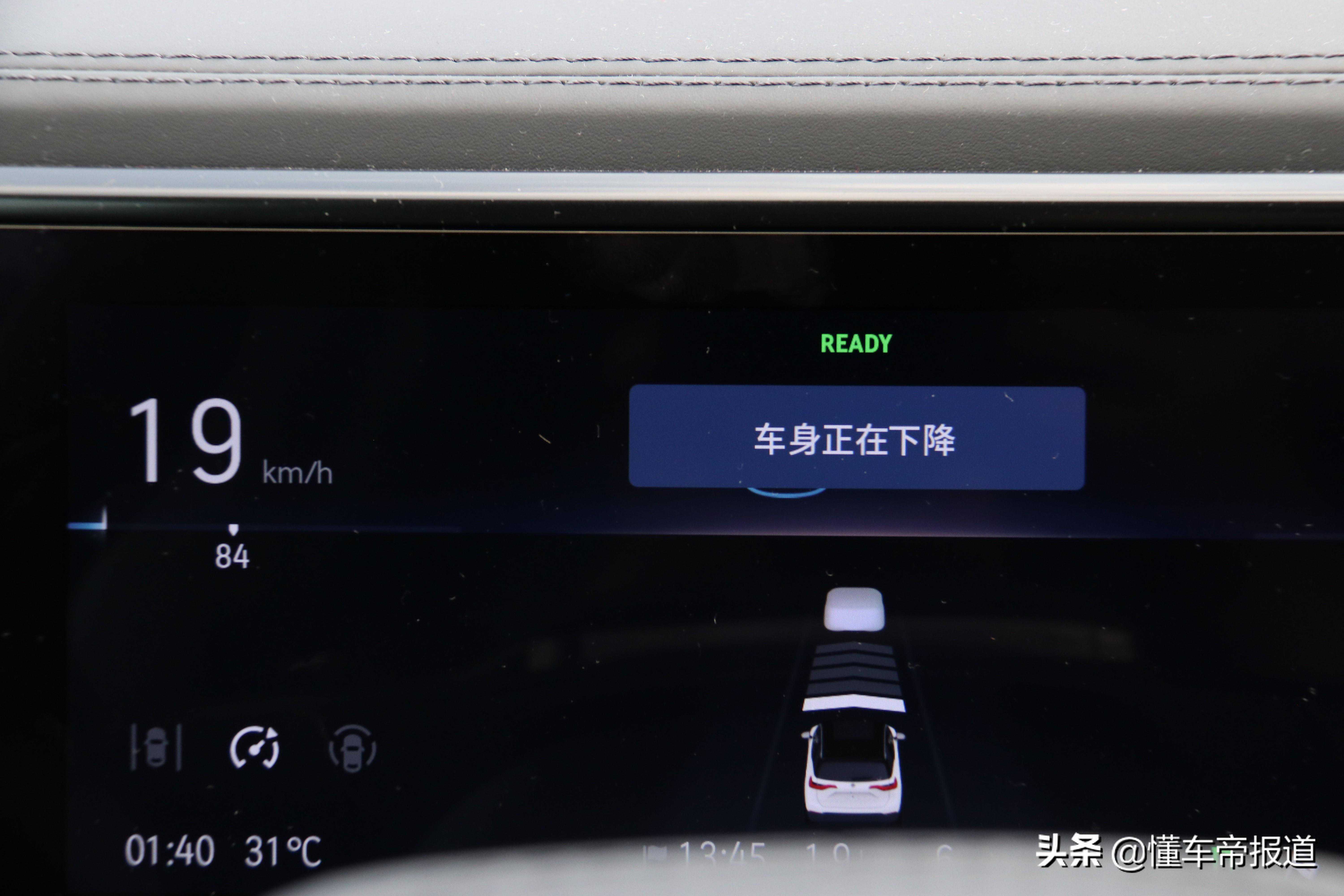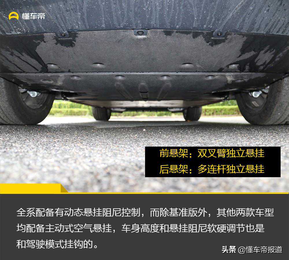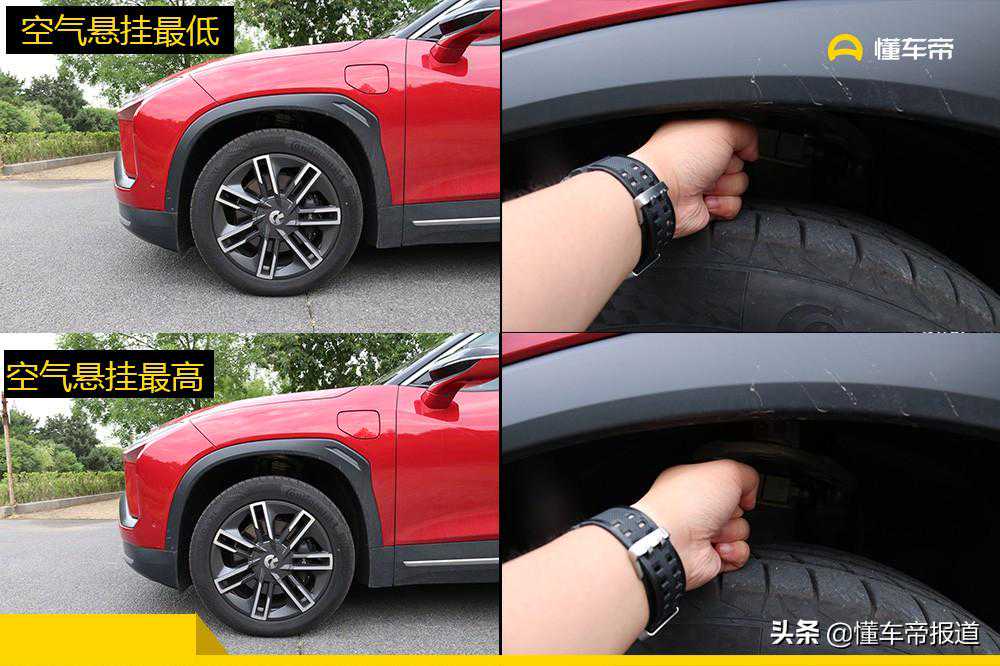 ES6采用了双叉臂前悬架和多连杆式后悬架,并且全系配备有动态悬挂阻尼控制,而除基准版外,其他两款车型均配备主动式空气悬挂,车身高度和悬挂阻尼软硬调节也是和驾驶模式挂钩的。其中把驾驶模式调到舒适和节能模式,车身高度会自动上升;而把驾驶模式调到运动模式下,车身高度会自动下降,在自定义模式下,可对车身高度进行自由控制。