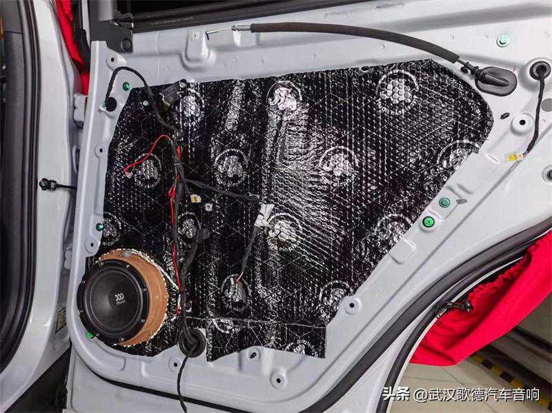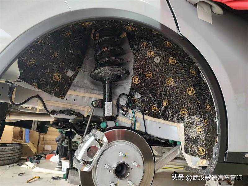 想要好的声音,良好的隔音必不可少。比亚迪唐的主要噪音来自于胎噪,因此我们将STPCSH小炸弹和航空AC06棉均匀的贴满在四个翼子板上,止振加吸音的双层搭配,来有效的降低车内的胎噪声。