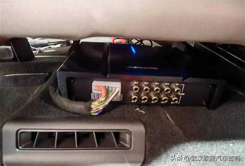 最后我们在座椅下方隐藏安装了一台阿尔派全新的R100-8DSP功放。大功率的输出可以很好的驱动喇叭单元,同时还能优化音频信号,为车主做全声场的音效调教。