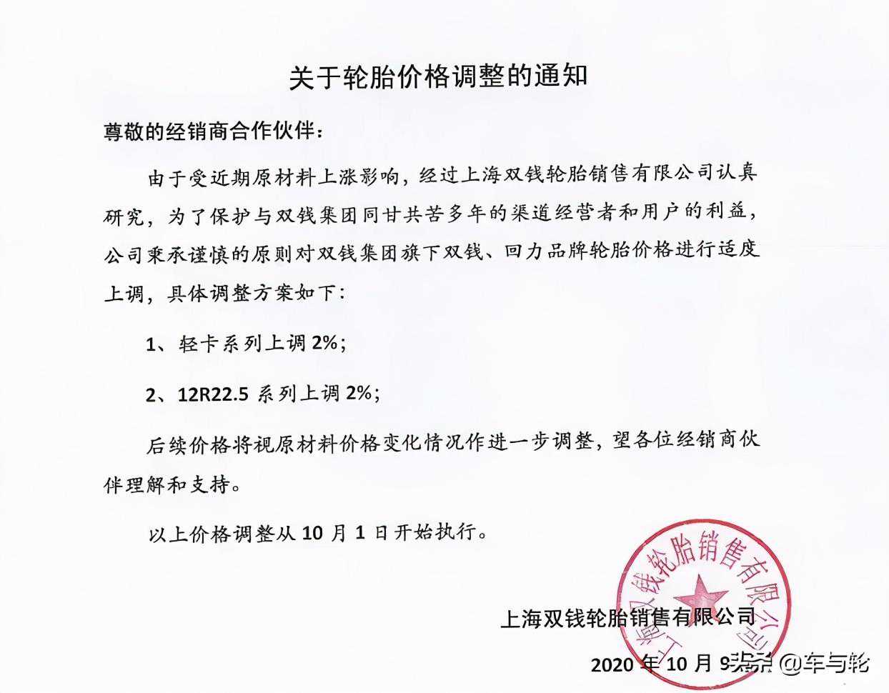 值得一提的是,虽然第三季度双钱轮胎依然在降价。但是十月开始,双钱各个分公司开始发布涨价通知,主要原因是原材料价格上涨。