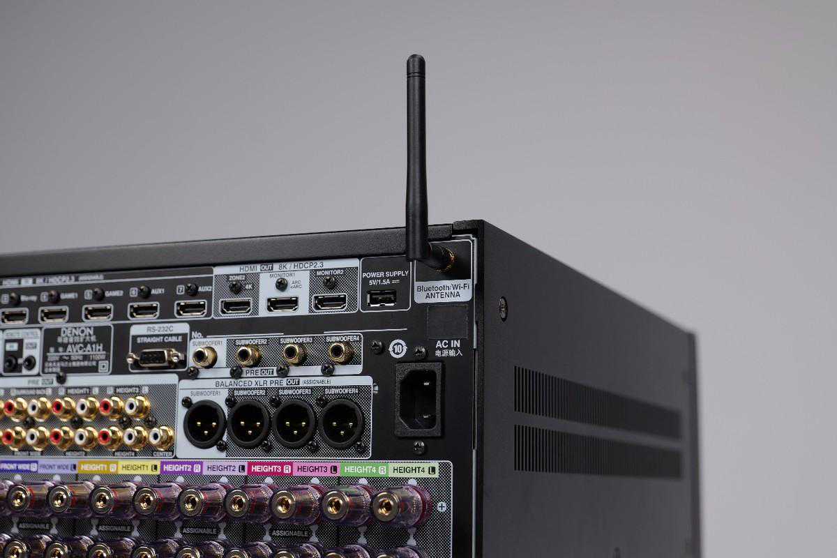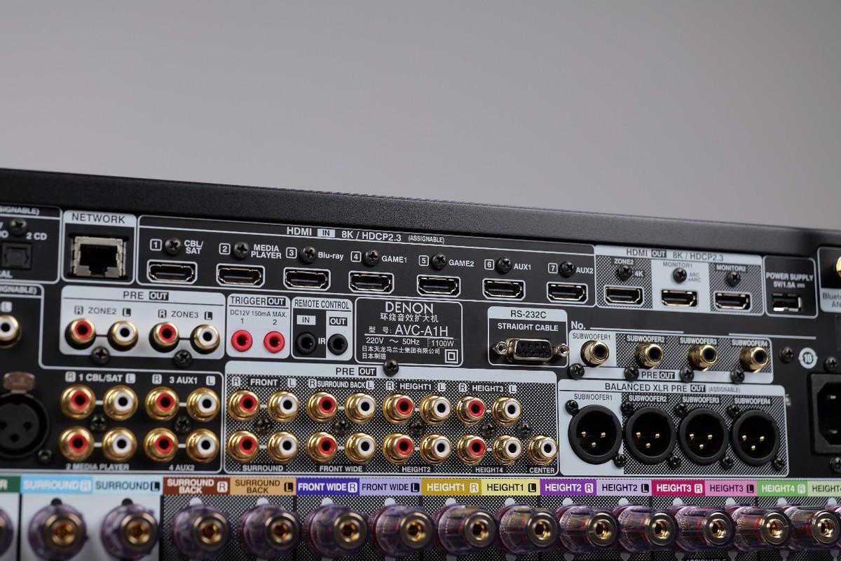 Denon天龙A1H的音箱的配置接口配置相当丰富,在增高声道上提供了多套的组合方案,比如增高声道数量设置为4组、6组、7组甚至是8组。丰富的配置可以让用户自行选择嵌入式还是外挂式地安装,或者选择杜比全景声的反射式扬声器。另外在超低音扬声器的连接配置上,摆放位置也可以精确地进行设定。